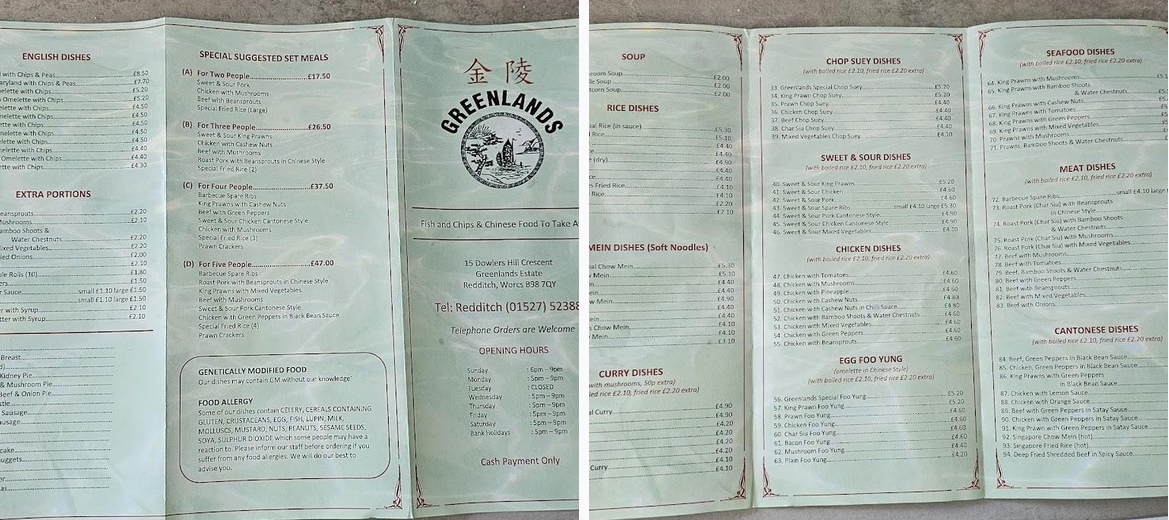 Welcome to Greenlands Chinese Take Away, your go-to destination for authentic Chinese cuisine in Redditch. Conveniently located at 15 Dowler's Hill Cres, we pride ourselves on offering a delicious range of dishes at affordable prices, perfect for a quick bite or a leisurely meal. Enjoy dine-in ambiance or takeaway options with a menu featuring favorites like chow mein and chicken curry, all prepared with fresh ingredients. Our casual atmosphere welcomes everyone, and we cater to various needs with wheelchair accessibility and ample parking. Join our loyal customers for an exceptional dining experience—delicious food awaits!Customers frequently rave about the freshly prepared food, which sets Greenlands apart from other takeaways. The Pancake Rolls, with their generous portions of Char Siu Pork, receive high praise for being flavorsome and satisfying. Reviewers also highlight the Curry Sauce, describing it as a perfect balance of sweetness and savor, with no bitterness lingering. Portions are another strong point; many face an abundance of food enough for leftovers. The welcoming staff, who remember many regulars' names, create a community feel that keeps patrons coming back for more. Many note the Chow Mein dishes for their meatiness and freshness, earning it the title of best takeaway in the area.